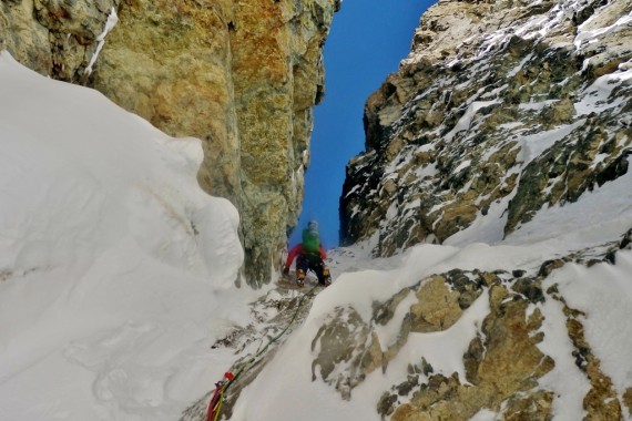 Nova smer EXIT v vzhodni steni Cerro San Lorenza med stolpom Pilar Sur in vzhodnim vrhom Cumbre Sur, ki sta jo preplezala Domen Kastelic in Domen Petrovčič. (foto člani odprave)