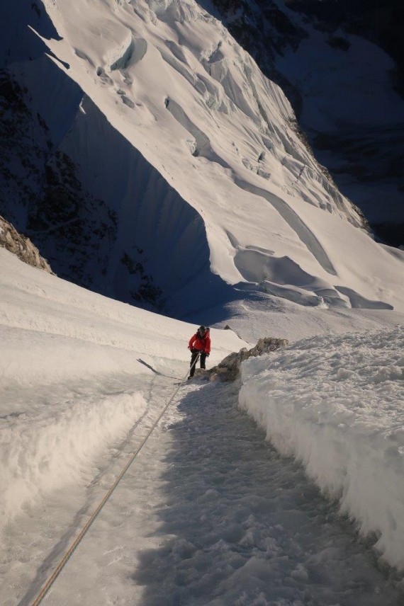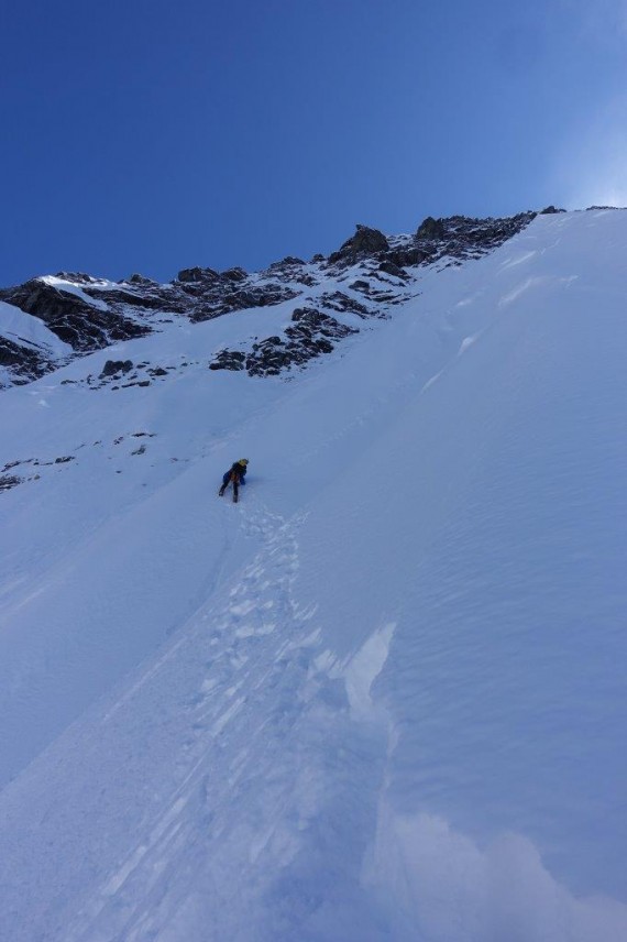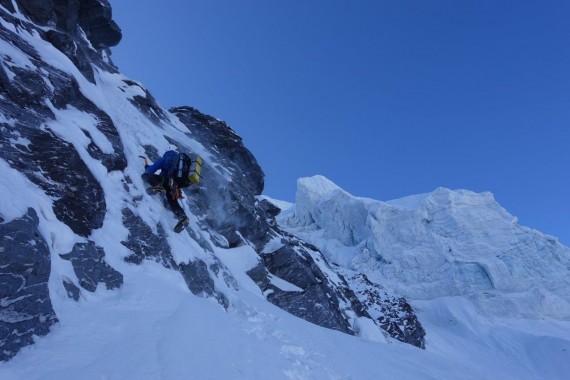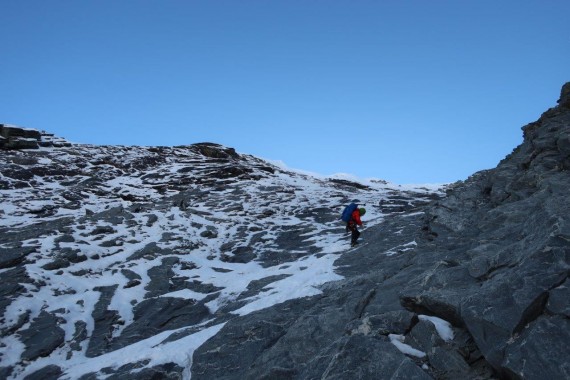 Greben ni bil težaven, prevladovale so mešane razmere, proti vrhu pa nepredelan sneg. Strmina ni presegla 75°. Sestopila sva po smeri pristopa, brez spustov po vrvi. Naslednji dan pa nazaj v bazo.