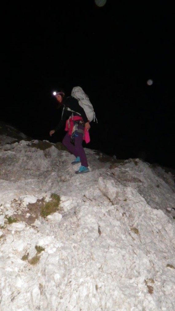 - 1. vtis (oddaja prtljage, sopihanje proti koči): Js sem Eva, Js sem Katarina ... Bla bla bla ... Kolk štrikov rabimo? Aha, tega pustimo tu. Ja, voda je na koči. Bla bla bla ... Miranda je že gor ... Kaj pa ti študiraš? Kako pa to? Jaz pa delam ... Bla bla bla bla ... Aha, kako super ... Bla bla bla ... Grizenje kolen v temi v družbi samih fajnih žensk, s katerimi se šele spoznavam, niti ni tako naporno in odveč. In v slabi uri in pol mi je uspelo, da sem si zapomnila vsa imena (sicer moja šibka točka).