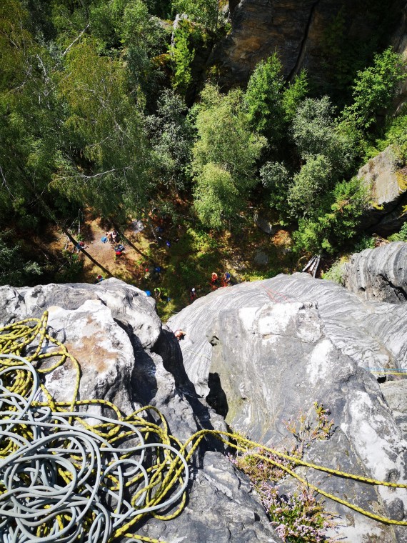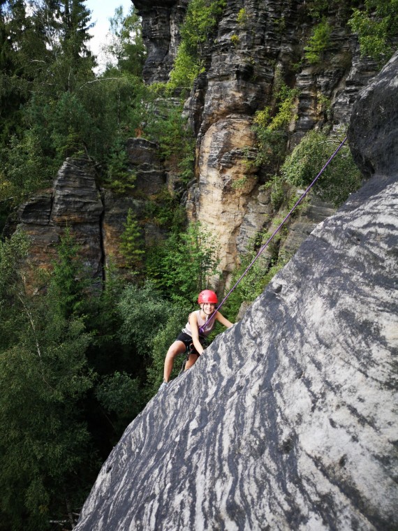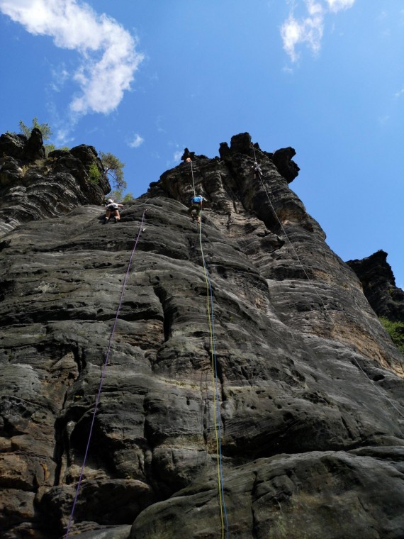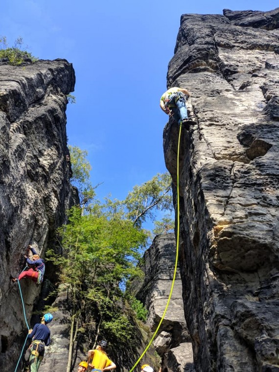 Skozi ta nepozaben teden smo splezali tako na nemške kot češke stolpe, se učili plezati poke, odlomili nekaj grifov, doživeli super abseile v prazno, dobro popraskali kolena, uničili blazinice in se učili izdelovati vozle za varovanje. V prostem času smo nasekali kar nekaj drv za večerni ogenj, se naučili igrati poker, se borili za mesto v viseči mreži, uživali na toboganih na bazenu, pošlatali tudi plastiko ter predvsem pojedli ogromno kumine (beri: doživljenske travme zaradi kruha s kumino).