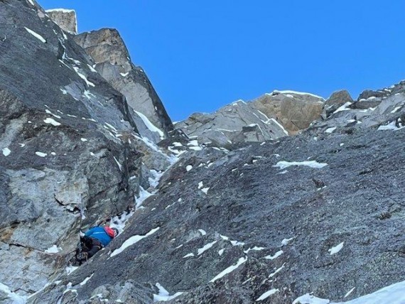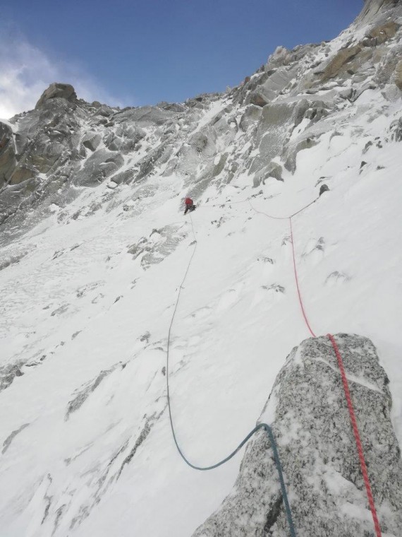 Naveza Petek-Habjan-Navršnik si je za cilj izbrala steno Velikih Jorassov. Tudi njim je dolg dostop iz doline vzel nekaj moči in so preživeli dodaten dan v zimski sobi koče Leschaux. V petek so zgodaj, v družbi dveh švicarskih alpinistov, zagazili proti Crozovi smeri. Količina novega snega pod steno je bila ogromna, zato so bili po 6-urnem dostopu do stene in dveh preplezanih raztežajih primorani obrniti. Anja je sobotno jutro izkoristila še za vzpon nad srednjo postajo gondole, z Mihaelom pa sva se vrnila po opremo na ledenik Argentiere.