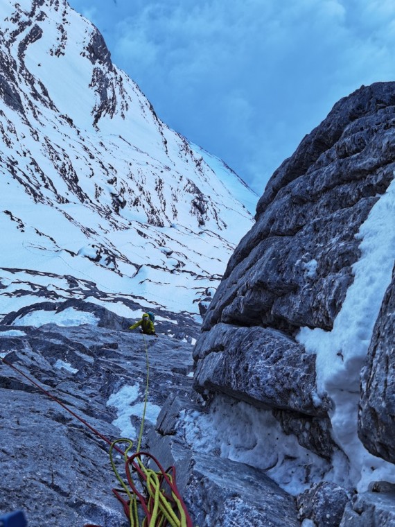 Ko si v petek popoldne, 15. aprila pod severno steno Eigerja postaviva šotor in začneva tajati prvo džezvo snega, se v tišini ozreva proti steni in vsak po svoje v mislih riše sled, koder bova plezala naslednji dan. Pogledovanje proti steni nama dviga občutek strahospoštovanja do te mogočne gore. Oba poznava dovolj zgodb povezanih s to skalno gmoto, da ne izgubljava besed o tem, kako spoštovanja vredna je. Hkrati pa sva hvaležna, da se imava možnost tudi sama preizkusit v njej. Tako že čez par ur, še pred prvo svetlobo, v družbi le polne lune, s precej lažjimi nahrbtniki kot so se tega lotili v letu 1938, sopihava proti prvimi prečkami Heckmairjeve smeri. Opazka, da se v steno odpravljava kot edina naveza, nama pospeši premlevanje v zvezi z razmerami v steni. Na veliko srečo so vidne sledi predhodnih navez, kar nama zelo olajša hitro napredovanje. S seboj namreč nisva vzela bivak opreme, saj upava, da bova še pred nočjo na vrhu. Po prvi četrtini smeri se prvič naveževa na vrv in nadaljujeva v izmeničnem plezanju.