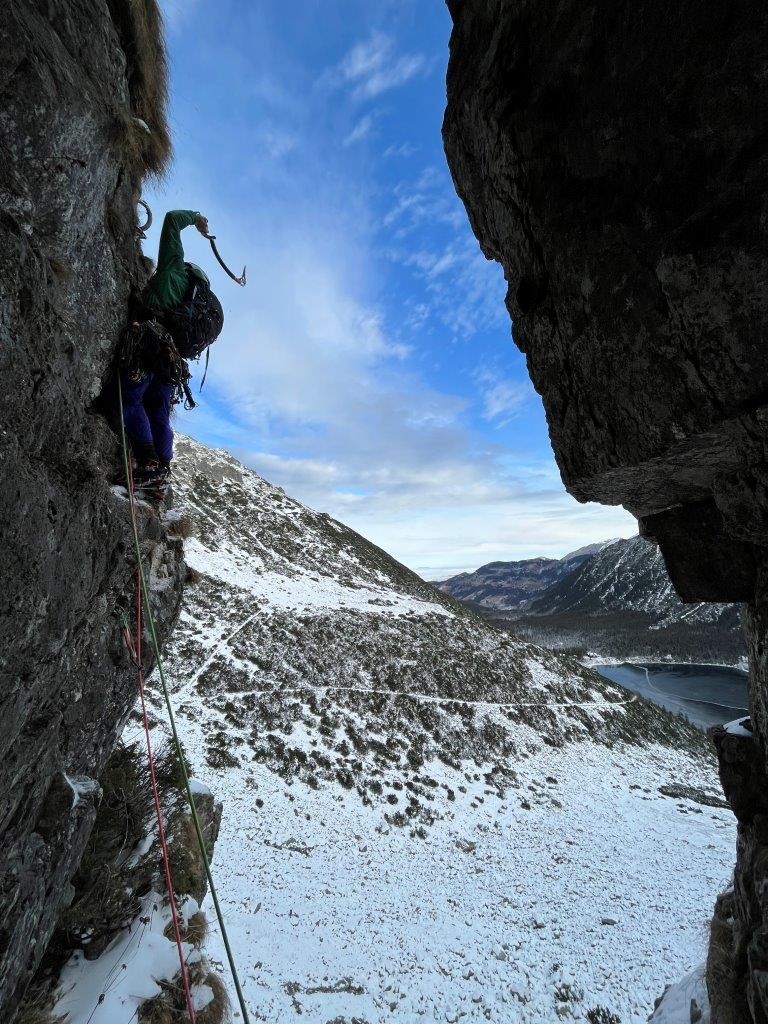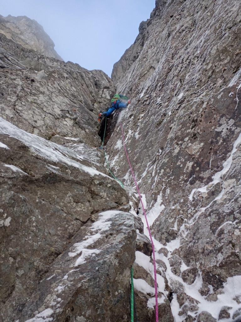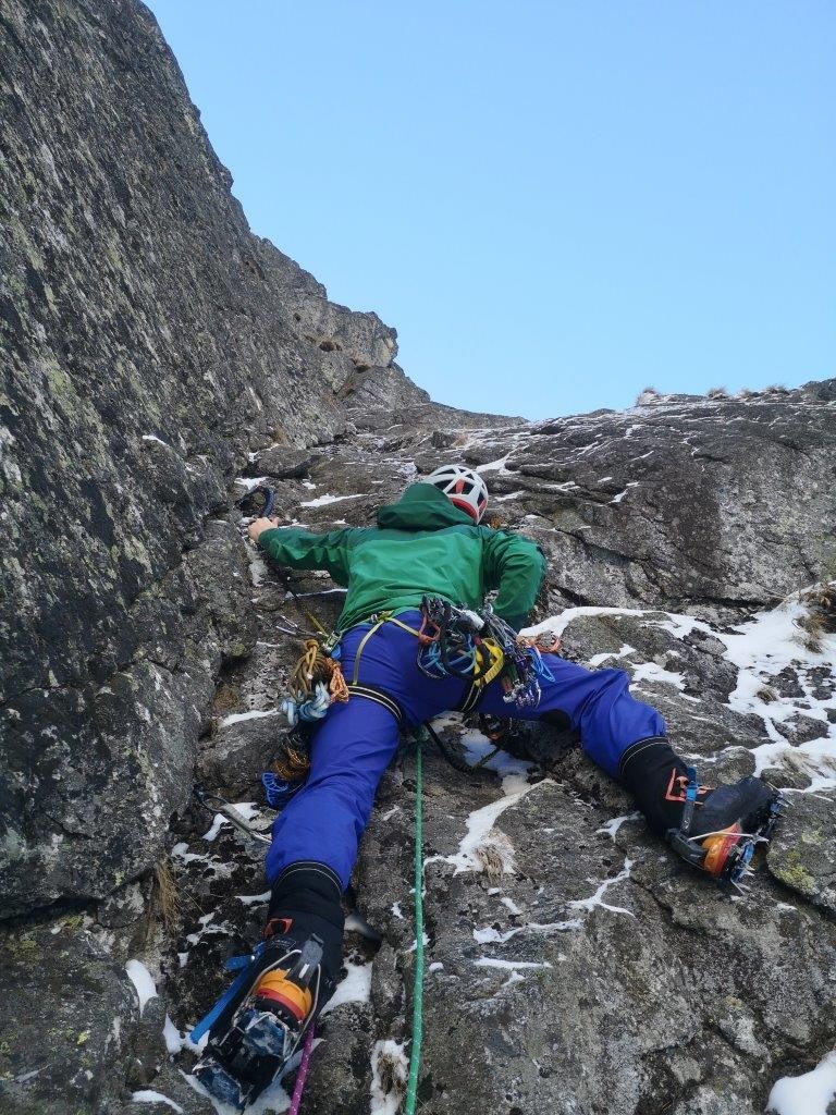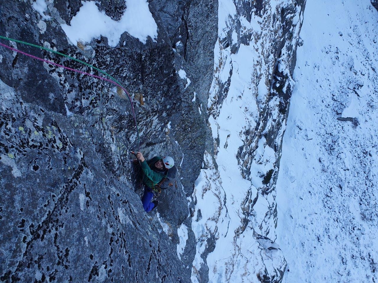 Plezanje v tem delu je ponujalo dobre možnosti varovanja in veliko zabijanja cepinov v šope trav. Sneg v steni je bil dober le za zimsko kuliso, prave opore cepinom pa ni ponudil. Kljub kratkemu dostopu in za naše razmere kratkim smerem, smo tako plezali od zore do mraka (in še čez).