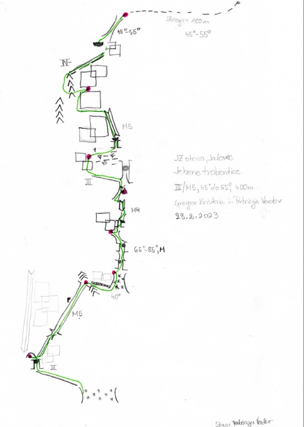 - prvenstveni vzpon: Jebene trobentice, JZ stena Jalovca, III/M5, 45 °-55 °, 400 m, Patricija Verdev, Gregor Kristan