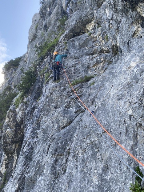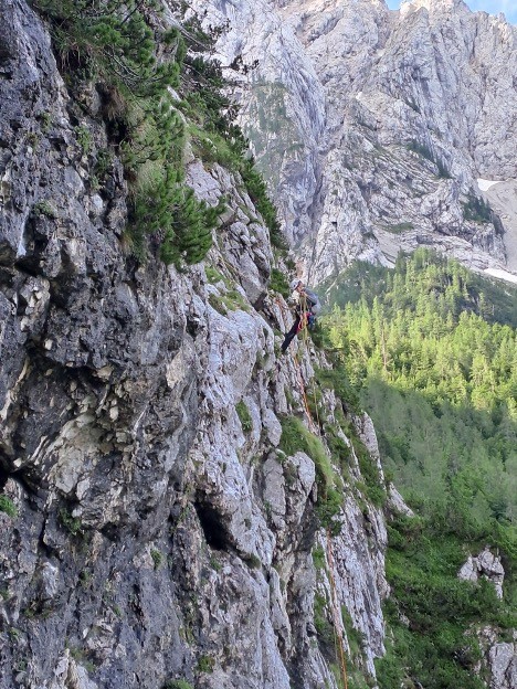 Nedeljsko jutro nam je kmalu pojasnilo, kako bo potekal dan. Ideje o obisku Ojstrice so žal prestavljene na bolj sušno obdobje, saj očitno severna stena Ojstrice ne sodi med hitro sušeče. Tako se je večina navez odpravila plezat v Ute in ena naveza v zid Škarij, saj je že sam pogled nanj izpred koče vabil v edine suhe plošče daleč naokoli.