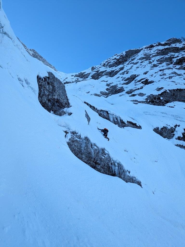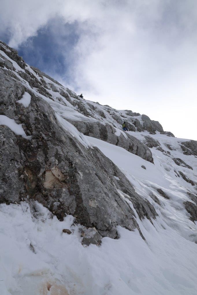 V petek si dopoldne vzamem čas, da si s pomočjo fotografske opreme pobližje ogledam stene, da bi kandidati zvečer lažje izbrali svoje cilje. V objektiv ujamem navezo Rozman-Mikuž, ki sta bila zelo mali piki v mogočni Loški steni, in ju s prostim očesom sprva sploh nisem opazil. Zvečer poročata o razmerah, in ena naveza se odloči, da poizkusi v soboto. Ostali dve naveze smo se namenili v SV steno Jerebice, ki nam je kmalu, ko smo pristopili do njenega ostenja, s pomočjo plazov, dala jasen znak, da danes ni dan za poskus v njej. Temperature so bile res visoke, prav nič zimske. Naveza št.1 je uspela v Loški steni, tako da smo se lahko veselili in skupaj praznovali še rojstni dan udeleženke. Naslednji dan, v nedeljo, smo dve navezi upali na nižje temperature in pa boljše razmere v SZ steni Prestreljenika, in se podali tja. Tretja naveza pa je odšla v SZ steno V. Pihavca. Zvečer smo se zbrali pred apartmajem, ki smo ga morali (na)hitro zapustiti, ker so prišli že novi gostje. Tako je zaključek sledil na klopci, za mizo v parku zraven drsališča, kjer smo pojedli še zadnje zaloge hrane, se družili in izmenjali vtise.