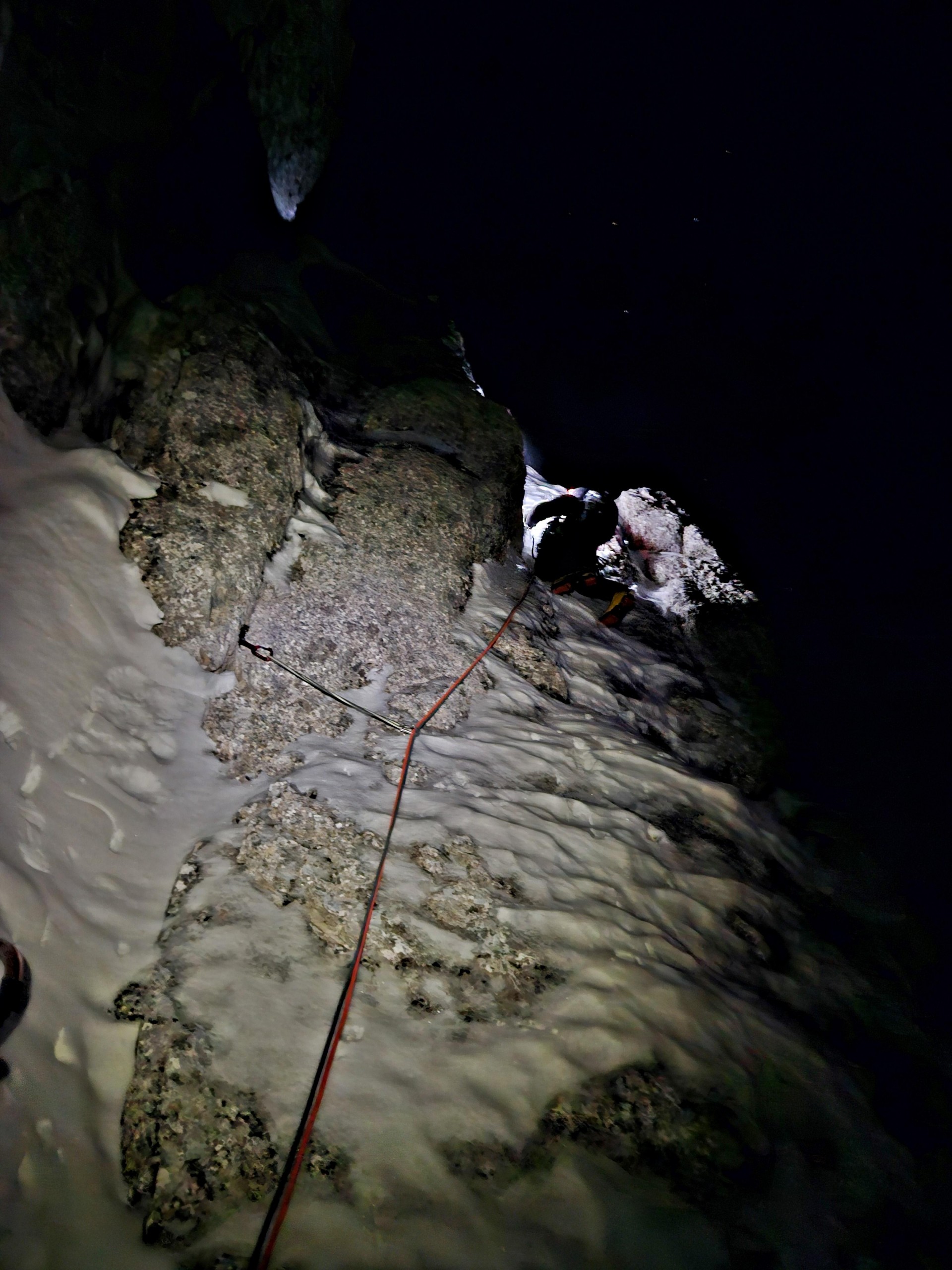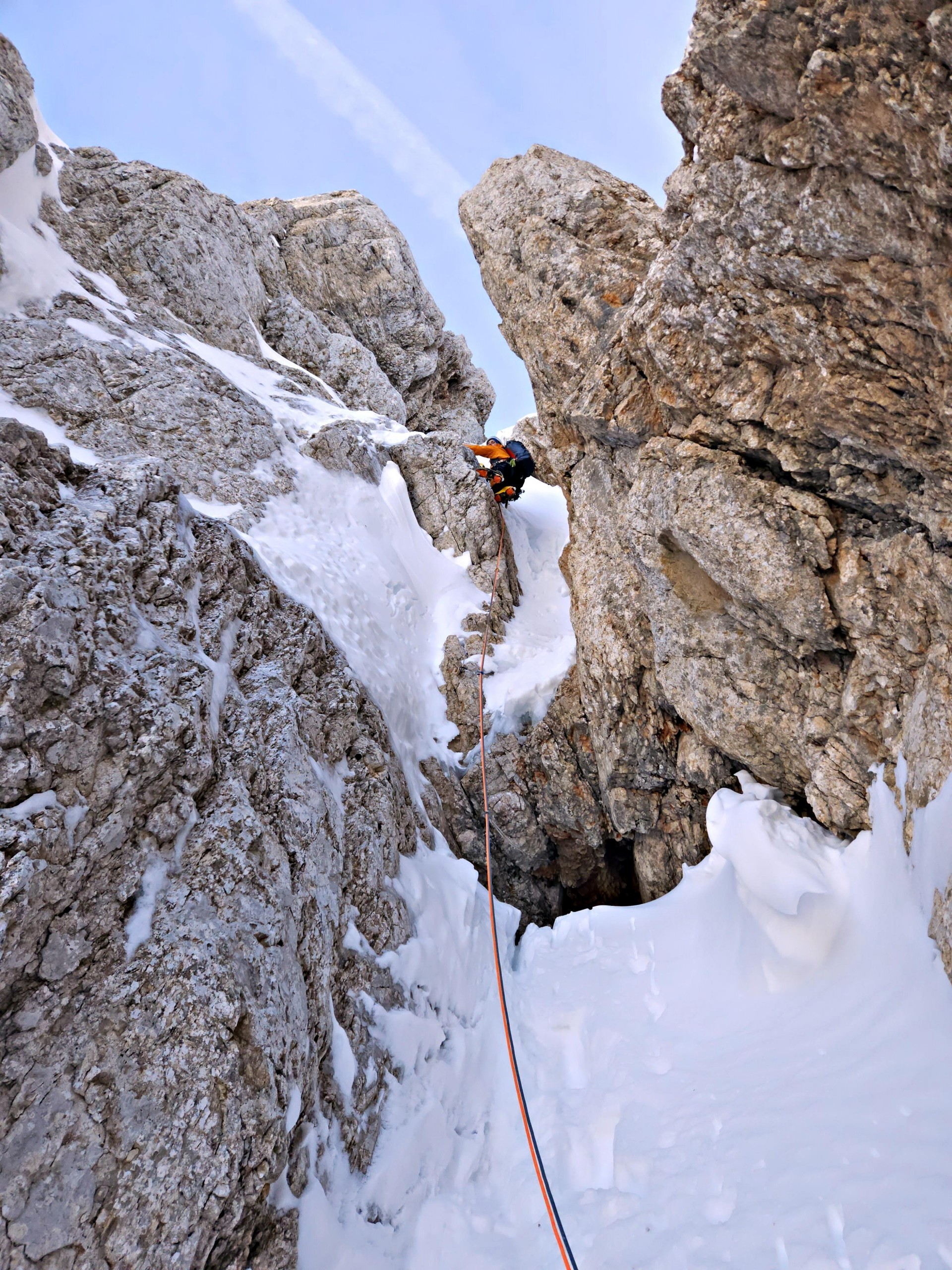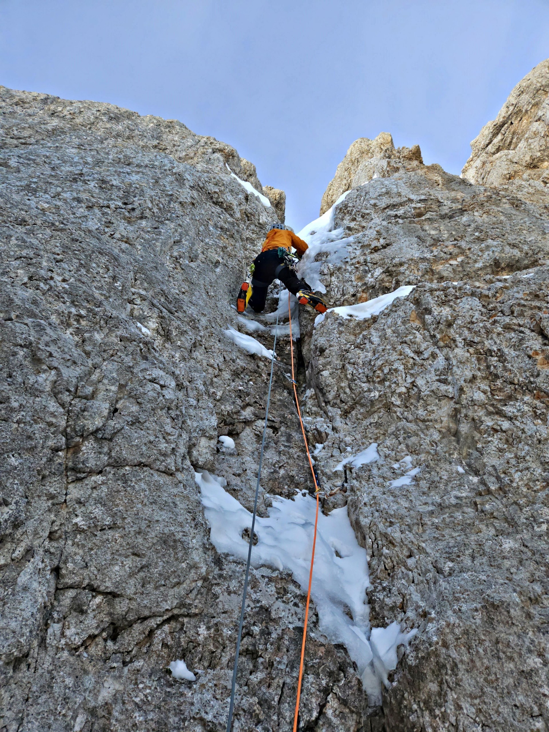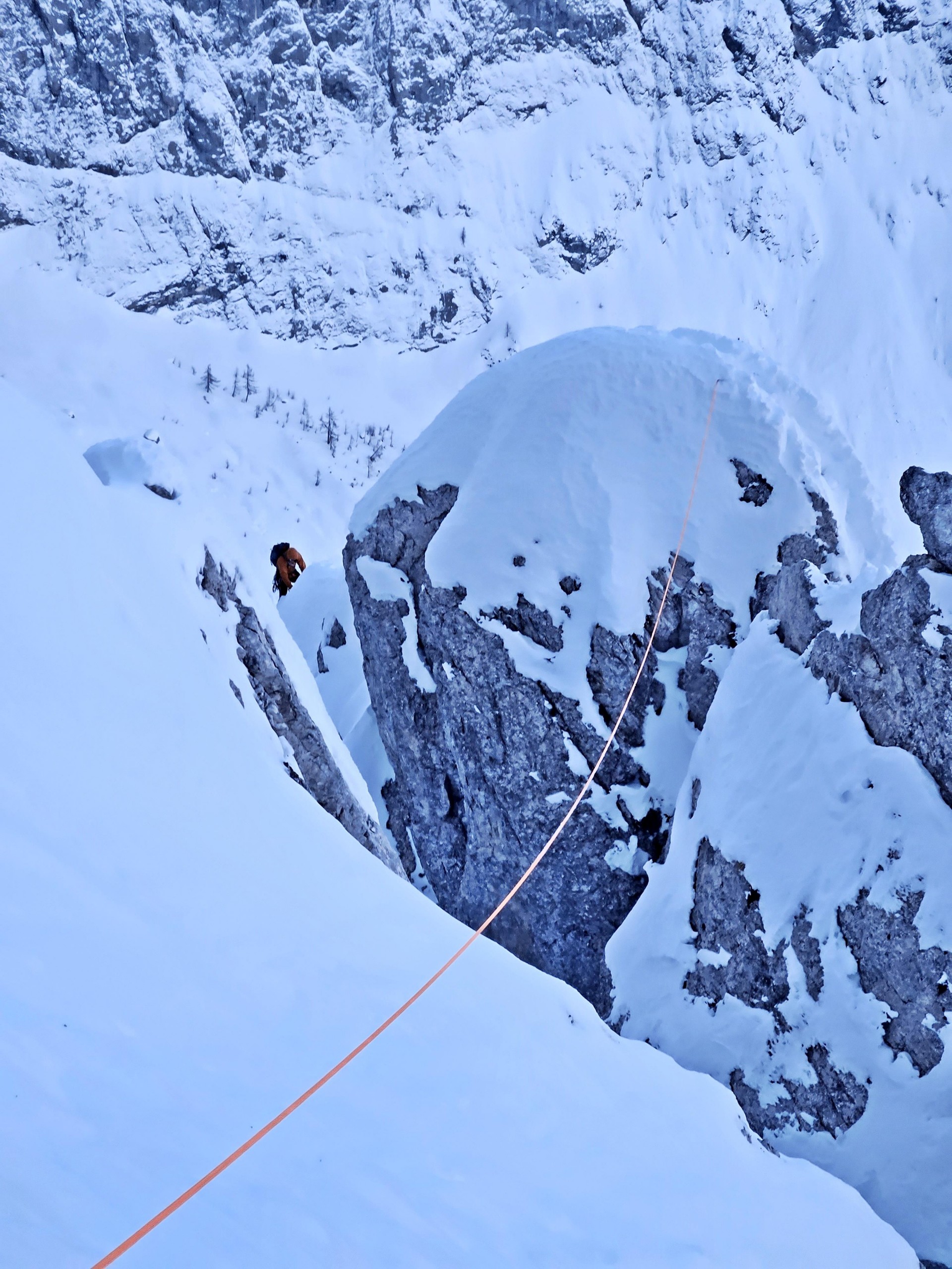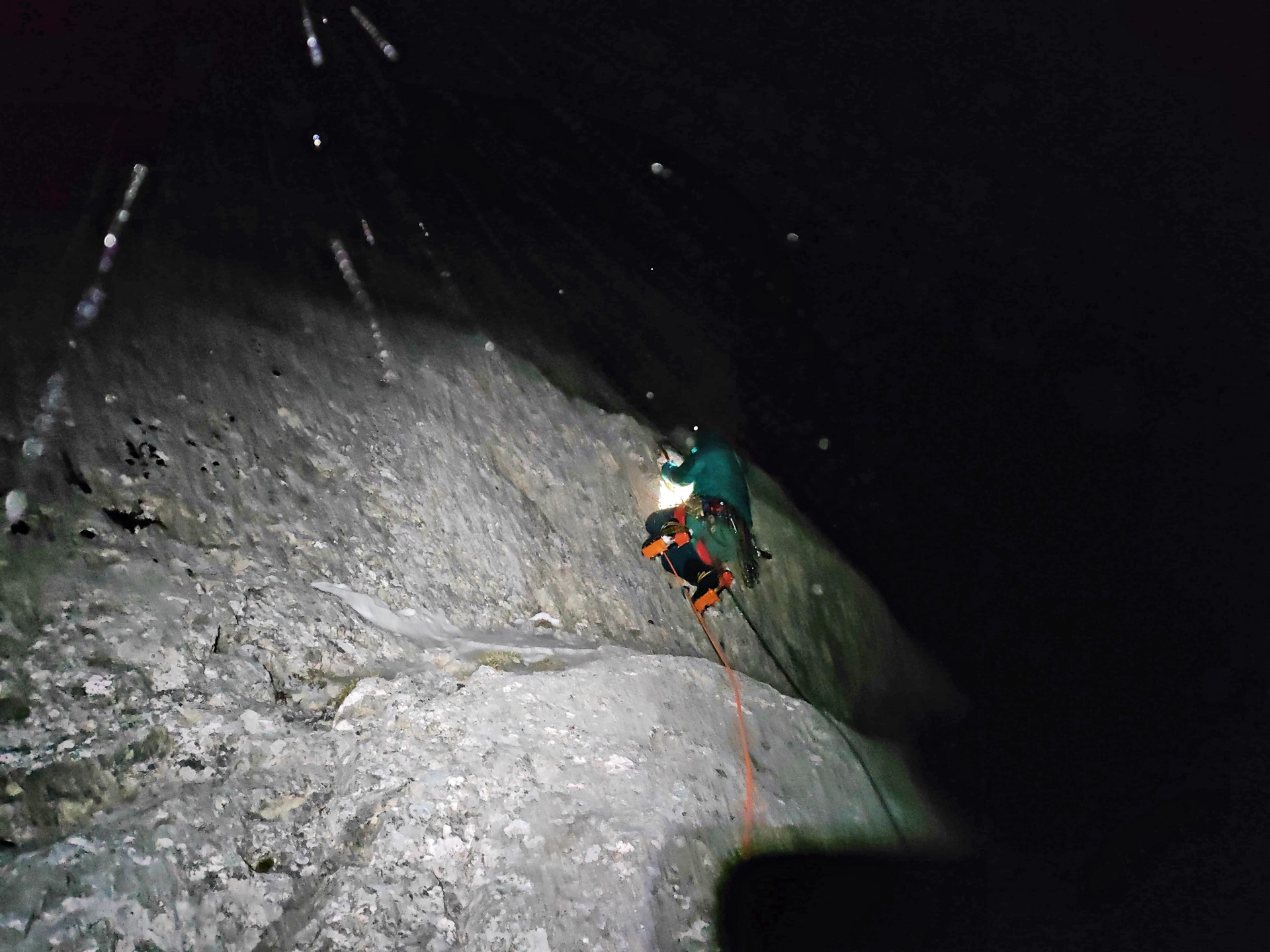 13. januarja se pozno zvečer, odpraviva prenočit pod prvo severno steno. Naslednje jutro še v temi plezava prve raztežaje Skalaške smeri v Špiku. Razmere v steni so bile kot pričakovano, fantastične, razen nekaj skalnih mest. Na vrhu stene si ob 20h, po 13 urah plezanja, dava kepco in nadaljujeva s sestopom ter dostopom do bivaka v Dnini.