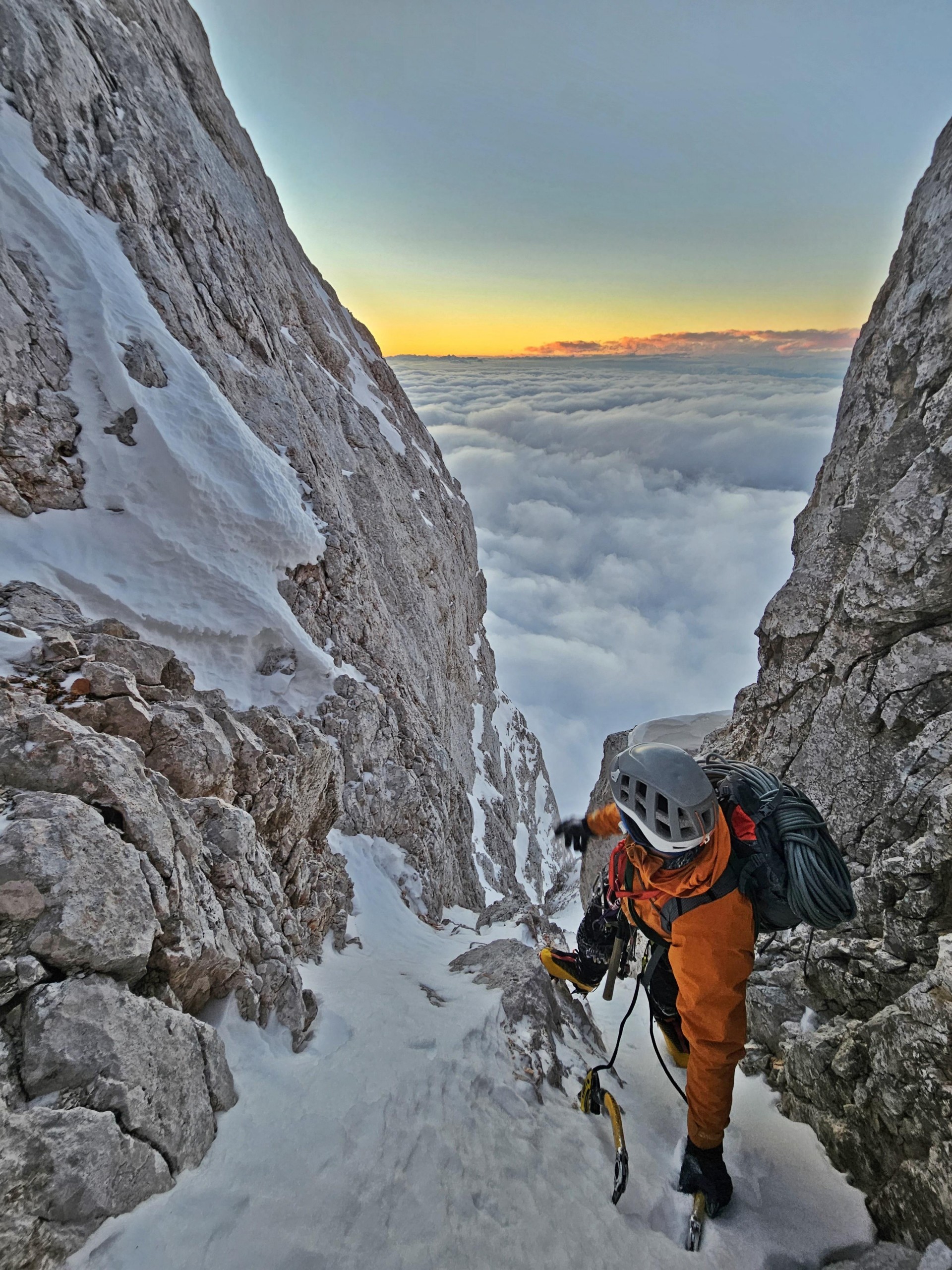Naslednje jutro se izkaže, da si, saj sva nadaljevala v severno steno Škrlatice. Kljub poznemu štartu sva na vrhu stala ravno ob sončnem zahodu. Najin trud je bil poplačan z veličastnimi barvami poslavljajočega se dne in s spokojno nočjo, ki je sledila.