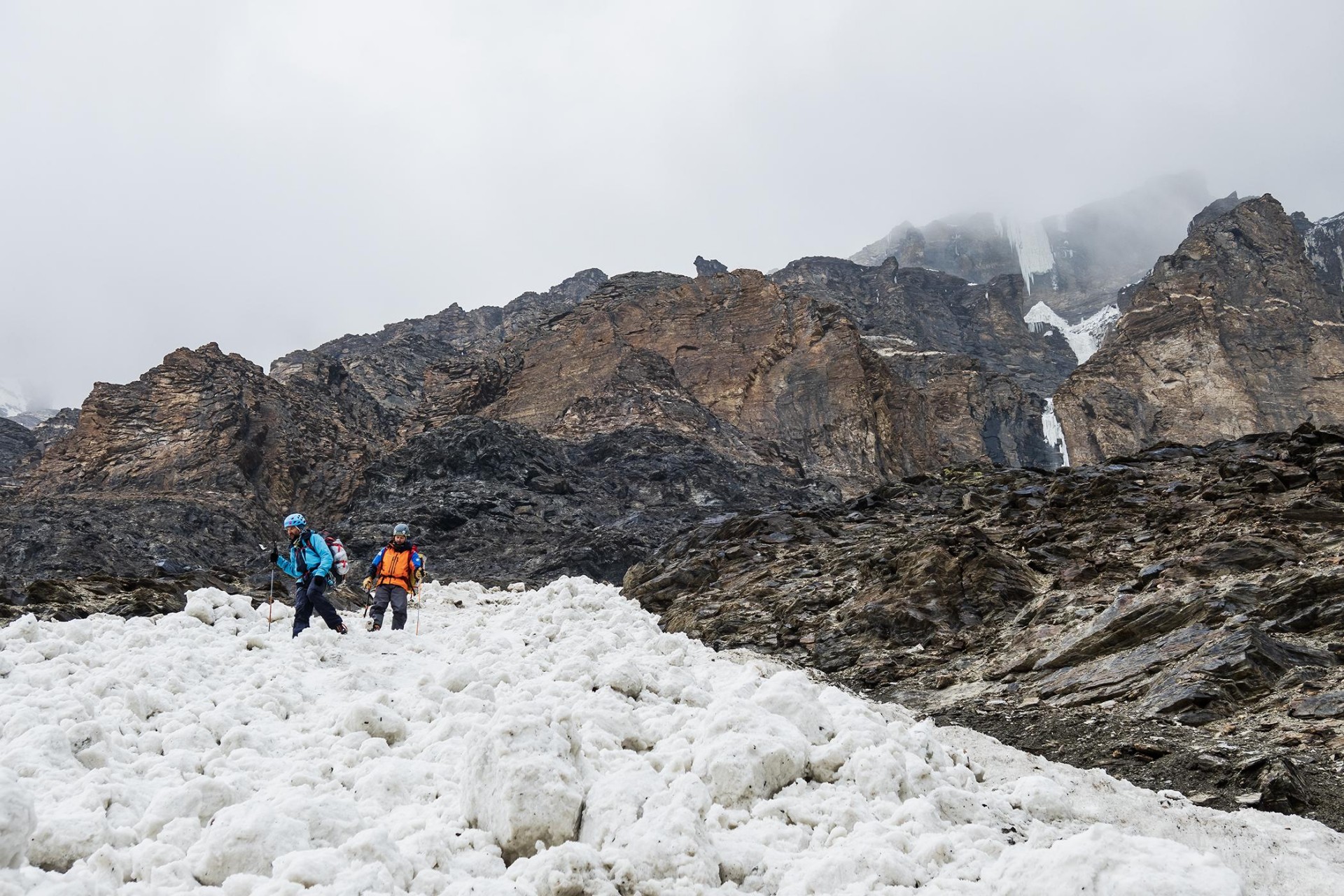 Z zanosom smo dostopili do vznožja stene. Tudi tokrat sta nam z nošnjo dobrovoljno pomagala Bhagwan in Dev. Zadnje tri ure smo sami trije prečili razgiban ledenik, posut s peskom, potem pa smo se mukoma vzpenjali po grušču do sneženega sedelca za stolpom, ki je bil od daleč podoben opičji glavi. Tam smo hitro postavili šotorček, saj nas je priganjala običajna popoldanska ploha.