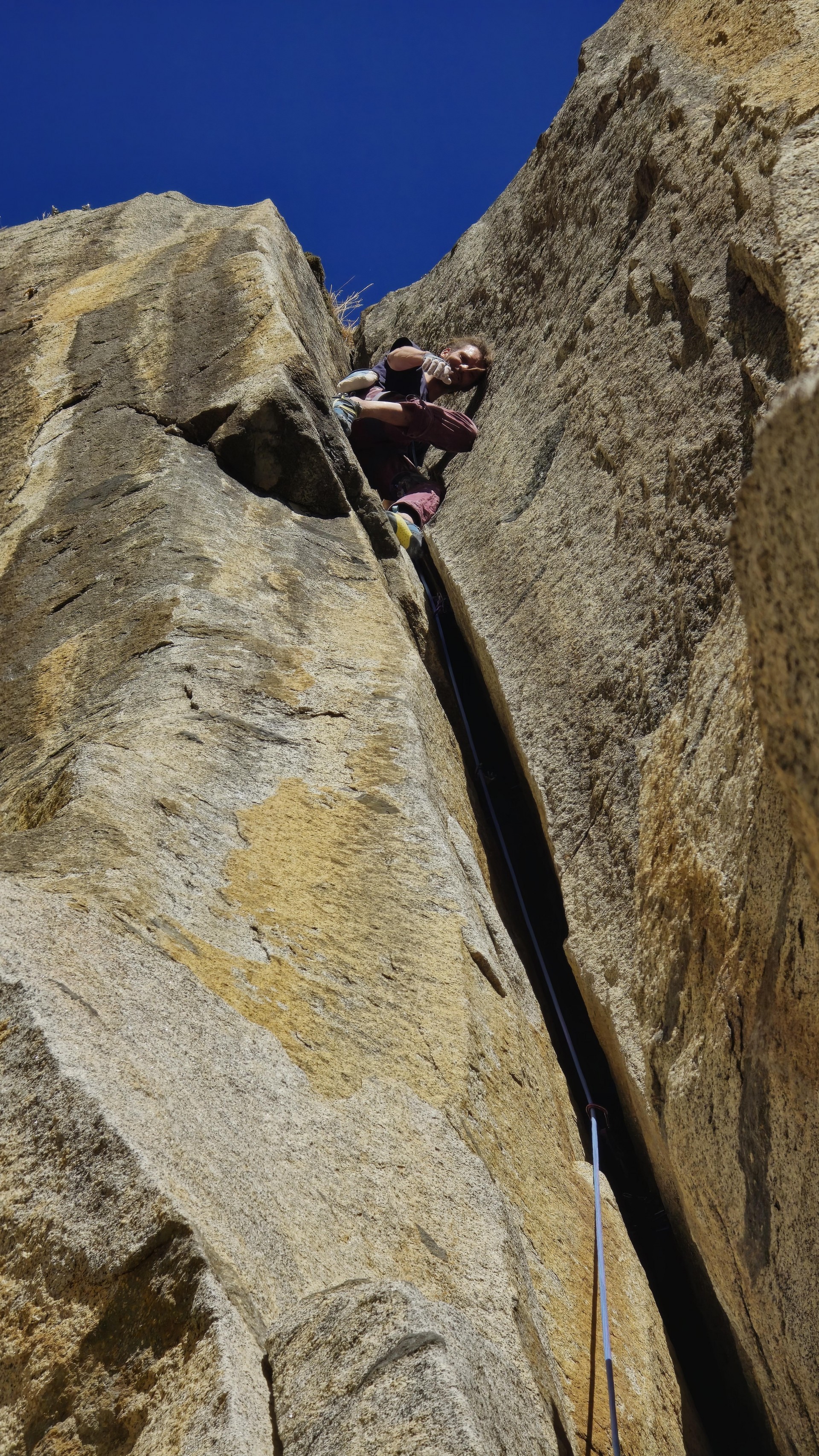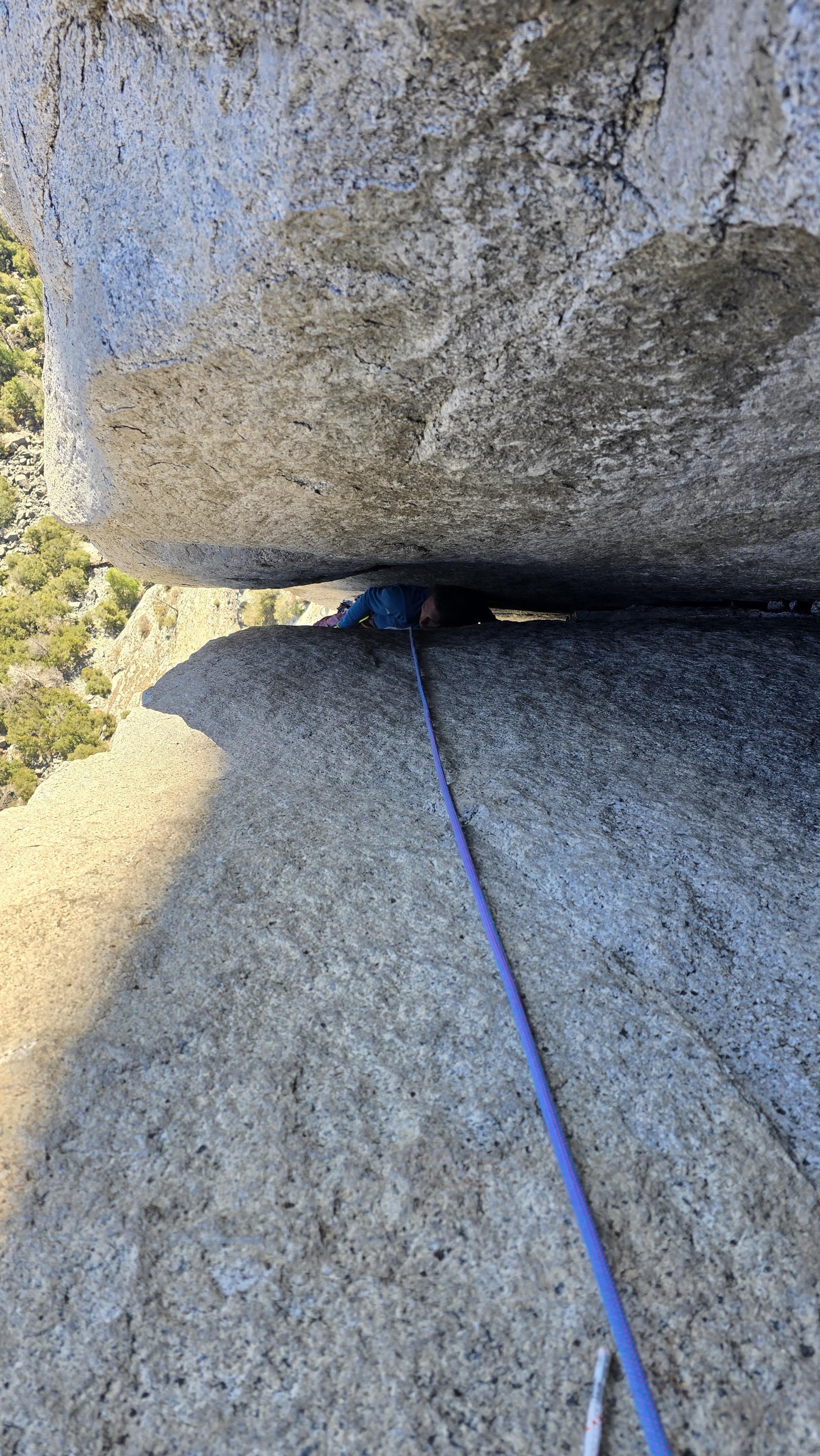 Drugi dan je sledilo žimarjenje (vzpenjanje po vrvi) 170 metrov, kolikor sta se prejšnji večer v temo spustila do baznega tabora, s sabo pa sta pritovorila še preostanek opreme, ki pa je tehtala vsaj 50 kilogramov, kar jima je vzelo veliko energije in časa. Zato sta naslednjih pet raztežajev odplezala po žgočem soncu, v delu smeri, ki je bil težji za orientacijo, skala slabše kakovosti, varovanje pa tudi ne najboljše. Kruder se je na pogled pregrizel čez detajl, nad njim padel, se spustil do sidrišča in ga preplezal v drugem poskusu. Med plezanjem celotne smeri je v steni padel le dvakrat, vse ostale raztežaje je preplezal v prvem poskusu.