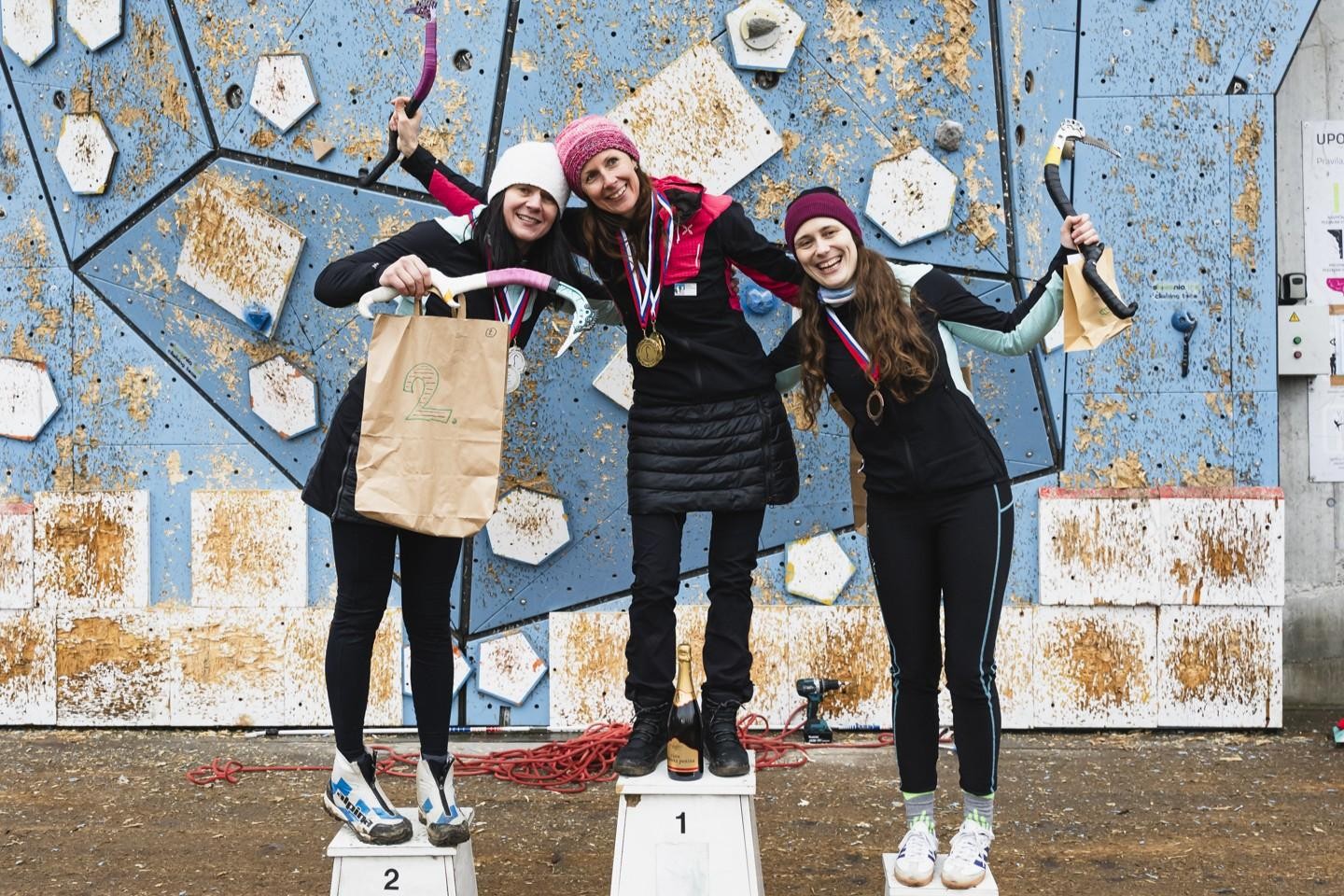 Državna podprvakinja Marta Krejan Čokl, državna prvakinja 2025 v tekmovalnem lednem plezanju Maja Šuštar Habjan in tretjeuvrščena Katja Brunec. (foto Aljaž Kern)