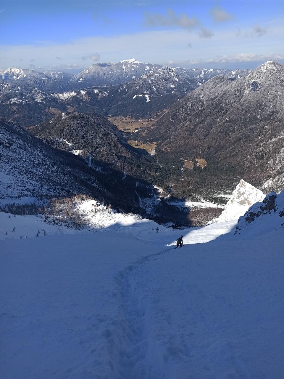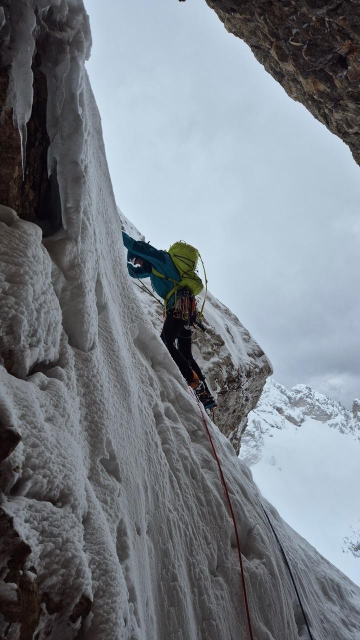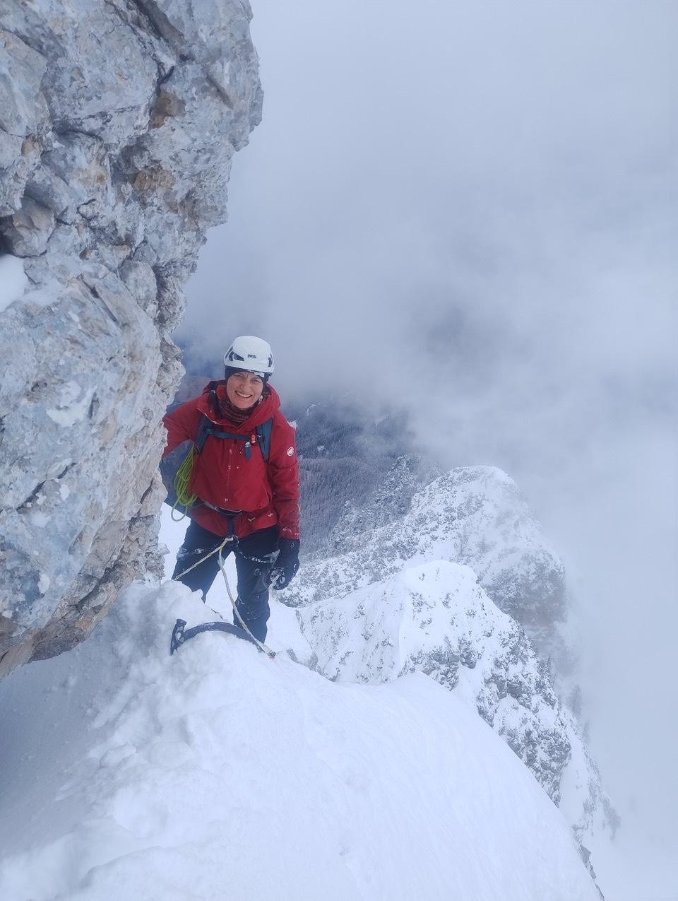Zjutraj smo se ne ravno zgodaj tako vse približno zdrave odpravile proti Dolgemu hrbtu. Nuša in Rebeka sta si za cilj zastavili Kratko Nemško in ga tudi uspešno izvedli, ostale (poleg mene še Veronika Foška, Ivona in Neža) pa smo šle proti Teranovi upajoč, da je tudi tam ostalo kaj od dobrih razmer. Tokrat ni bilo potrebno zgaziti celega dostopa, temveč samo en del, saj sta bila pred nami še dva pogumneža s podobnim planom. Že ko smo hodile proti steni, se mi je zdelo, da se zgoraj nad snežišči delajo neke meglice, ko pa smo bile pod smerjo, je bilo jasno, da so te meglice mini pršni plazovi, ki jih je veter sipal dol po smeri. Sprva se niti niso zdeli tako kritični, ko pa smo nekaj večjih dobile v obraz med plezanjem prvih dveh raztežajev, smo se raje odločile za umik in si rekle, da »ni vsak dan nedelja«. Sledil je še ležeren sestop po soncu, ki nam je nazaj vlil nekaj morale in tabor smo zaključile s sončnimi očali in nasmeški na obrazu.