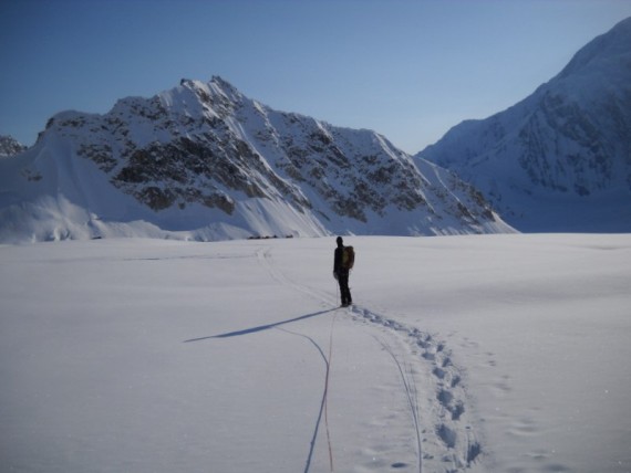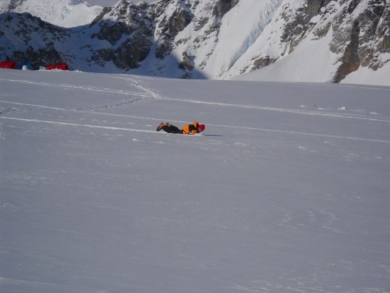 upala, da se bo nekako vseeno izšlo. Poleg tega sem v prvi polovici bivanja zbolel, in v kakšnem prestavljanju v višje tabore pod Denali v nikakršnem primeru ne bi bilo govora. Prvo ugodno vremensko okno sva nato izkoristila za plezanje v Mt. Hunterju, raje kot da bi nadaljevala proti kampu 14 000 pod Denalijem, saj sva bila za priprave in single-push plezanje Cassina že prepozna, tudi če bi vreme držalo do konca odprave. V smeri se je izkazalo, da mi je teden ležanja v šotoru z vročino pobral več moči, kot sem si mislil, tako da sva se odločila za povratek. Na predzadnjem spustu z vrvjo naju je še za nekaj minut objel oblak pršiča iz bližnjega velikega pršnega plazu, ob povratku v bazo pa Matic ni mogel več obremeniti noge zaradi kosa ledu, ki ga je zadel v koleno že na prvem sidrišču v smeri. Sledil je še teden dni življenja v bazi in plezanja (Matic pa je moral mirovati), nato pa povratek v dolino, 3 dni pred predvidenim, za kar sva se odločila zaradi prihajajočega vremenskega poslabšanja, ki ti lahko onemogoči odhod, ko ga imaš predvidenega. Ves čas odprave smo v bazi bivali skupaj z drugo slovensko odpravo, Blažem Navršnikom in Matjažem Dušičem.