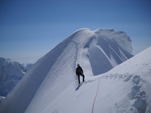 Ob prvem lepem dnevu sva z Arnetom odšla plezat Jugozahodni raz Mt. Francesa. Lepo plezanje po včasih kar ozkem razu. Prvi od petih težjih raztežajev, v ozadju Foraker