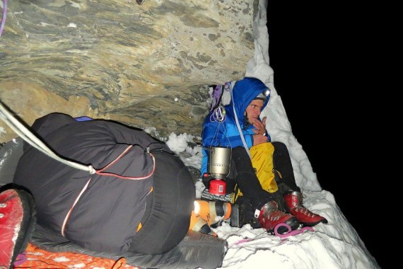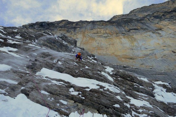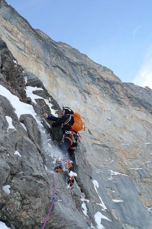 Naslednje jutro smo ob prvi svetlobi začeli s plezanjem in že v prvih raztežajih je bilo jasno, da naša naloga ne bo tako enostavna kot je izgledalo na prvi pogled. Da so razmere daleč od idealnih je ugotovila tudi lokalna naveza, ki je priplezala za nami in se brez večjih pomislekov, čez okno v steni, po železniških tirih odpravila nazaj proti dolini. Z uporabo drytooling tehnike smo prosto preplezali »težko poč« ter si po »Hinterstoiserjevi prečki« že v temi uredili bivak v »lastovičjem gnezdu«.