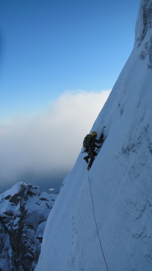 Tako sva se 3. marca odpravila v severno steno Vågakallna. Po uri pristopa sva prispela pod steno. V spodnjem delu smeri sva imela odlična razmere in sva plezala nenavezana, višje v steni pa so se razmere slabšale, zato sva morala